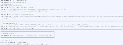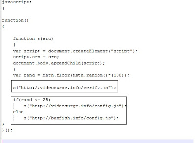 If user runs this malicious JavaScript in the address bar, the script will randomly load one of two JavaScript files from different domains. The “config.js” is actually used to further spread this scam using different descriptions of the video. This JavaScript file not only posts the same flash video message to user’s wall, but also their friends walls. Here is partial screenshot of “config.js” file:
