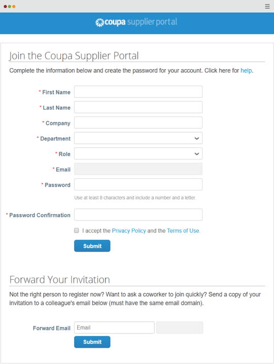 - Click on the “Join Coupa” link at the bottom of the email to begin the registration process