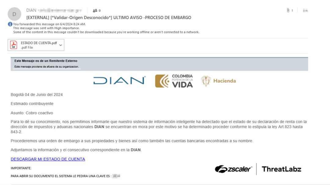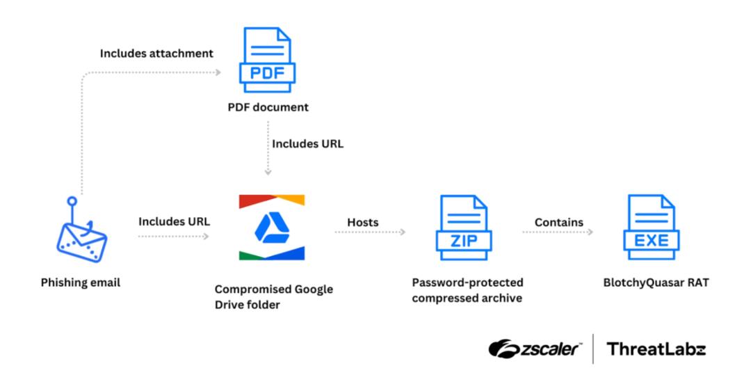 In June 2024, ThreatLabz identified new activity from BlindEagle (also known as AguilaCiega, APT-C-36, and APT-Q-98), an APT group targeting government and financial sectors in Colombia and Ecuador. This campaign delivered modified QuasarRAT, called BlotchyQuasar, through phishing emails impersonating the Colombian Tax and Customs National Authority (DIAN). The malware targeted the Colombian insurance sector, aiming to steal payment data. The figure below shows the BlindEagle attack chain.