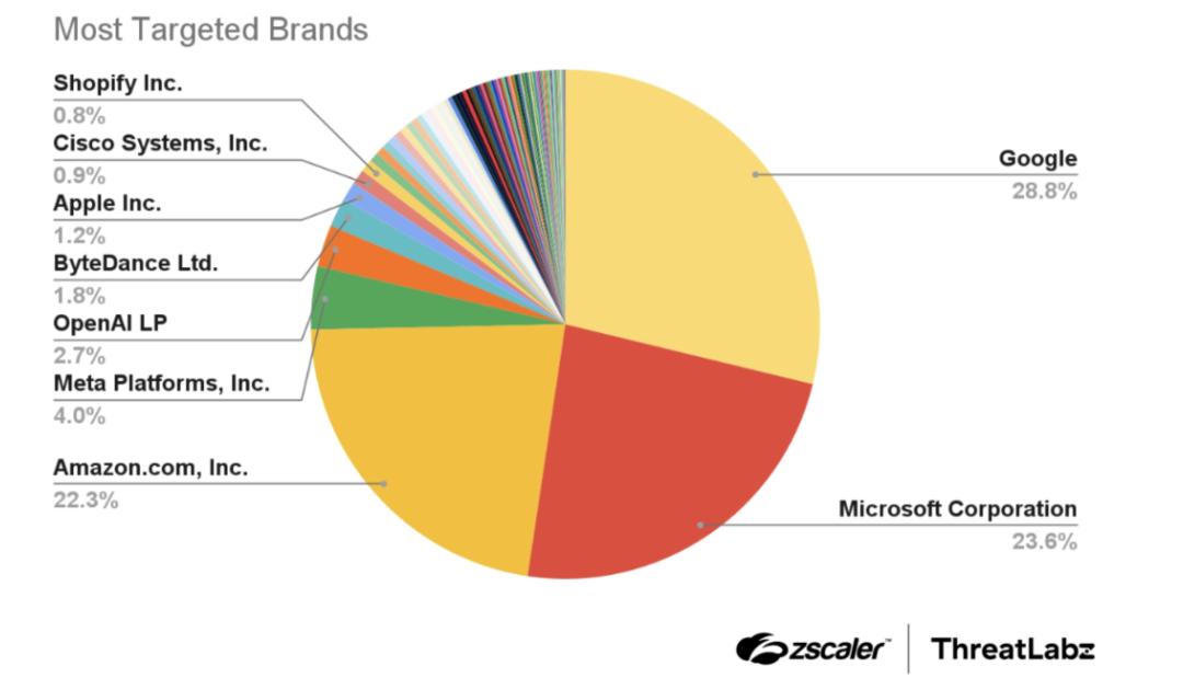 From February 2024 to July 2024, ThreatLabz analyzed over 30,000 lookalike domains and identified 10,000 as malicious. The most targeted brands were Google, Microsoft, and Amazon, accounting for almost 75% of phishing domains, as shown below.