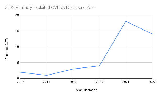 The top takeaway from the report is that, “malicious cyber actors exploited older software vulnerabilities more frequently than recently disclosed vulnerabilities and targeted unpatched, internet-facing systems.” It seems attackers are more focused on the issues you should have patched for the last two years than today’s headline-grabbing vulnerability. The report is based on their analysis of 42 of the most routinely exploited CVEs observed in 2022. The following chart shows which year each commonly exploited CVE was disclosed.