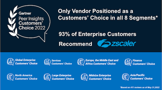 Zscaler erhielt im Rahmen des „Voice of the Customer“-Reports von Gartner Peer Insights für SSE 2022 die Auszeichnung „Customers‘ Choice“