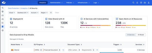 - Risk Correlation: Combines data and AI risk scores with misconfigurations and sensitive data exposure