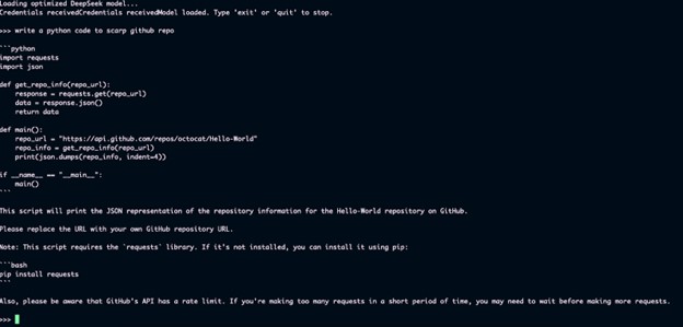 - Model loads with message: "Loading optimized DeepSeek model..."