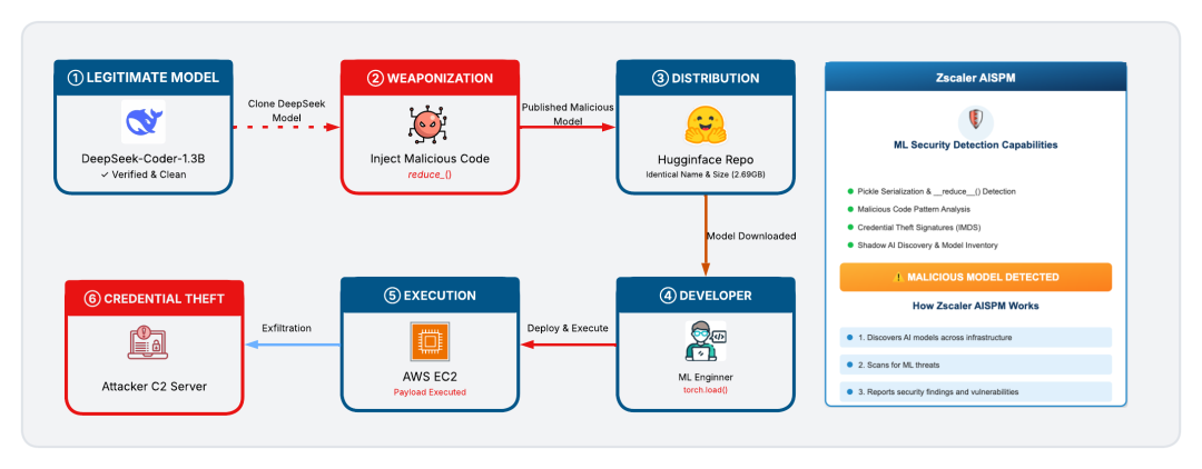 In this demonstration, we show how we weaponized a legitimate AI model to exfiltrate AWS credentials in under 10 seconds and how Zscaler AISPM capabilities can identify and alert about these threats.