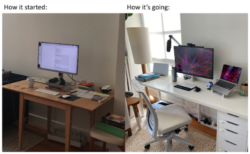 Haben Sie das Gefühl, dass Sie in den letzten drei Jahren eine digitale Transformation durchlaufen haben, die normalerweise ein ganzes Jahrzehnt dauern würde? Ich jedenfalls schon. Sehen Sie sich nur die Vorher- und Nachherbilder meines Homeoffice an. Aus einem behelfsmäßigen Esstisch, den ich zum Schreibtisch umfunktioniert hatte, wurde ein voll ausgestatteter Arbeitsbereich mit Licht, Mikrofonen und Kameras – eine pandemiebedingte, aber phänomenale Entwicklung!