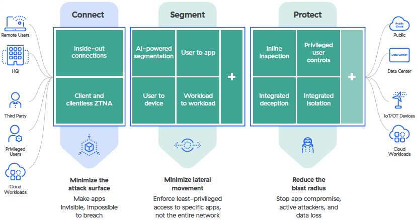 Zscaler unterstützt mit seiner ZTNA-Lösung der nächsten Generation, Zscaler Private Access, breit angelegte Initiativen zur Sicherheitstransformation und neue Anwendungsfälle. ZPA bietet Konnektivität zwischen allen Entitäten und Ressourcen, Zero-Trust-Segmentierung und integrierte, kontinuierliche Sicherheit. Mithilfe dieser Funktionen können Netzwerksicherheitsteams ihre Angriffsfläche reduzieren, die laterale Ausbreitung von Bedrohungen minimieren und eine konsistente, nahtlose User Experience gewährleisten.