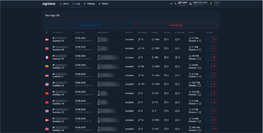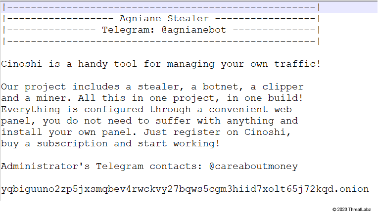 - Availability: Agniane Stealer is part of Cinoshi Project - a MaaS that offers services and subscriptions on the dark web.