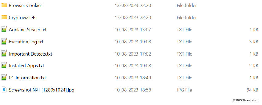 - Stealing Capabilities: Agniane Stealer is an information stealer that takes stored credentials from web browsers, Telegram sessions, Discord tokens, Steam, WinSCP, and Filezilla sessions. In addition, It saves a screenshot of the user’s desktop, quickly collecting OpenVPN profiles and system information.
