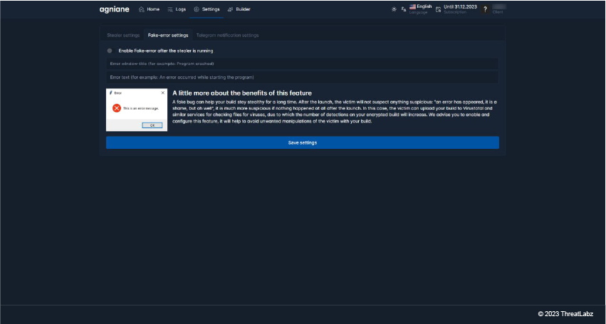 The fake-error settings option also functions as a form of protection for Agniane Stealer. Enabling fake error messages allows threat actors to remain undetected for longer periods of time.