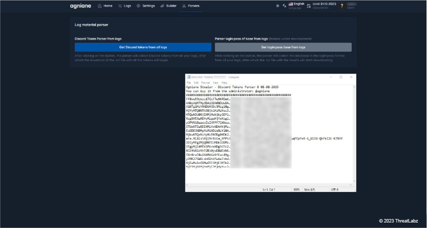 This screen displays options to parse victim logs. A threat actor can use a Discord token or use a login pass (feature under development).