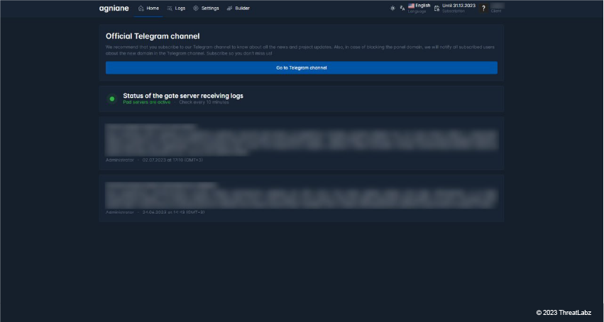 In the screenshot below, you can see the Agniane Stealer Home tab. The interface encourages you to follow the Telegram channel in case the domain is blocked. In addition, this screen indicates the status of the gate server.