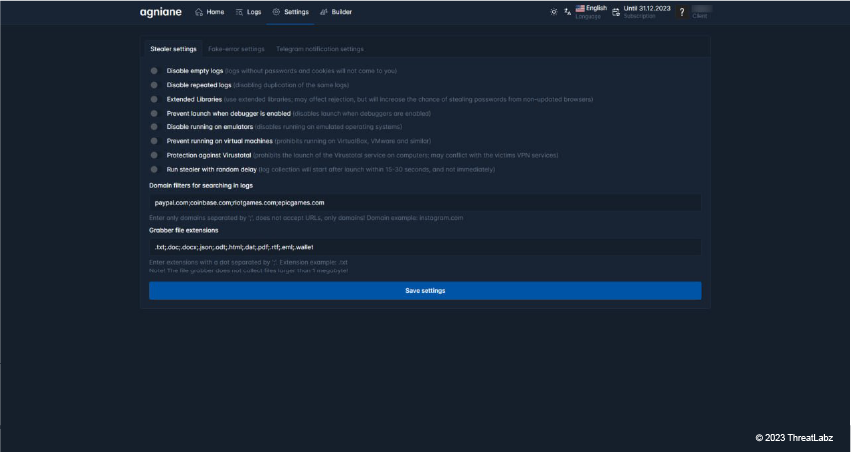 The Stealer settings section allows a threat actor using Agniane Stealer to configure settings in a way that facilitates their nefarious intentions. A threat actor can: disable logs, extend libraries, and even prevent the malware from running during security inspection and analysis using anti-analysis techniques.