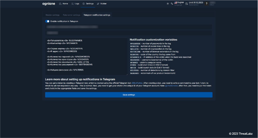 The Telegram notification settings screen shows you how to set up Telegram notifications on your system and it lists various custom variables that correspond to relevant stolen data: number of passwords in the log, username, etc.