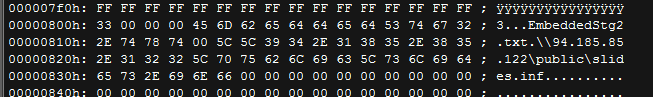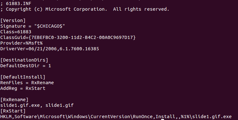 The embedded OLE Object 2 contains the remote location of the setup information file - INF file that contains information used by Windows to install drivers. In this case, the INF file slides.inf contains information to rename and execute the BlackEnergy Trojan executable file slide1.gif as seen below: