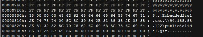 The exploit payload involved in this case is a PowerPoint Open XML Slide Show file named spiski_deputatov_done.ppsx. This file contains two malicious embedded OLE objects which point to remote files as seen below: