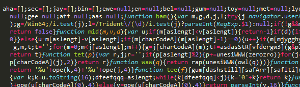 The landing page for Angler is typical, with a substantial amount of randomized code and whitespace, but scrolling to the bottom reveals that there are multiple strings delimited with '3~4' and the split function is declared toward the top of the page.
