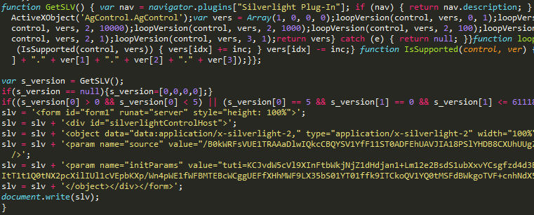 Taking a look at the deobfuscated code, there are several structures that are consistent with well-known exploits being served, including functions for 'flash_run' and 'GetSLV':