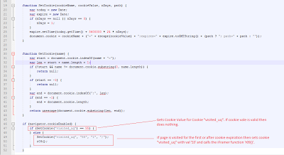 De-obfuscated JS checks a cookie value to determine if the page was loaded in the browser previously. If the code is being loaded for the first time, it then creates a cookie called "visited_uq" which is set with a value of "55" for one day with a path of '/'. It then calls function which creates an iFrame.