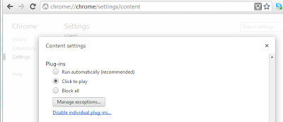 In the latest versions of Chrome, Click to Play is well hidden! To enable it one must go to the Wrench Icon - Settings - Show advanced settings - Content settings...then scroll down to Plug-ins and select "Click to Play". That's five clicks to access the option. This is definitely restricted to power users! If you do not know what "Click to Play" means, you are out of luck because there is no mouse-over or popup to show more information.
