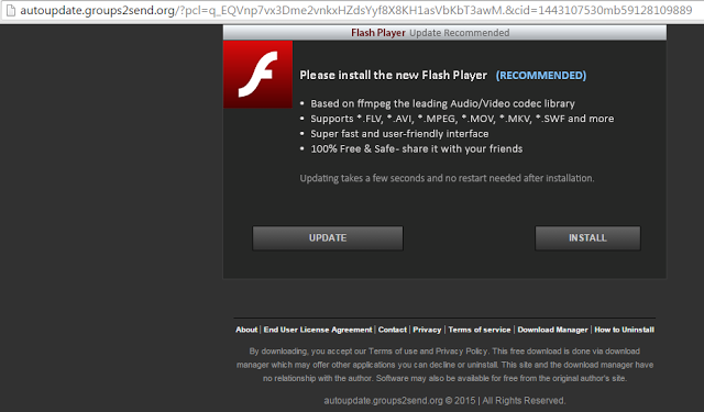 The page prompts the user to update or install a new flash player update. Regardless of the option the user selects, a fake Adobe Flash Player application is downloaded.