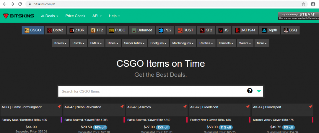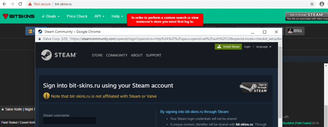 To perform a custom search or add items to a cart, users are asked to sign in with their Steam credentials. As the user clicks on the “Sign in through STEAM” button, a Steam login window pops up.