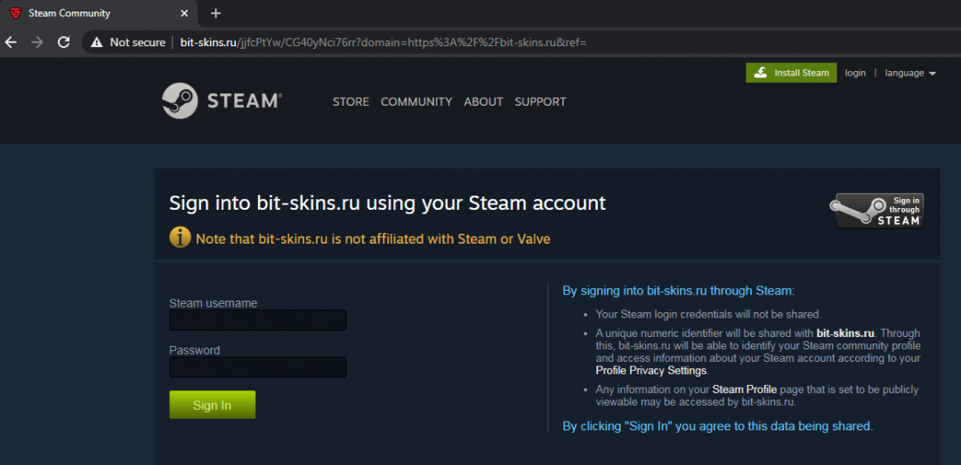 Figure 6: The fake Steam login page, which is used as a pop-up on the main page