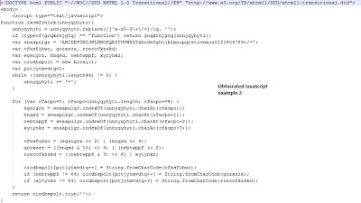 As I mentioned in the earlier blog post, these are fake security attempting to coerce the victim into downloading fake antivirus software that will download additional malware onto the system. The code for doing these animations and initiating the download of malicious binaries is hidden inside the malicious script. Let’s decode the main script. The malicious JavaScript code has two functions defined and three lines of code to decode the content. Here is how they look: