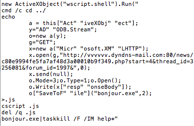 Uses cscript.exe (command-line version of Windows Script Host) to run commands that are "echoed" to a file ".js" which downloads contents from: