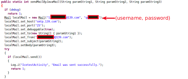 A username and password for an email id were found hard-coded in the malware.