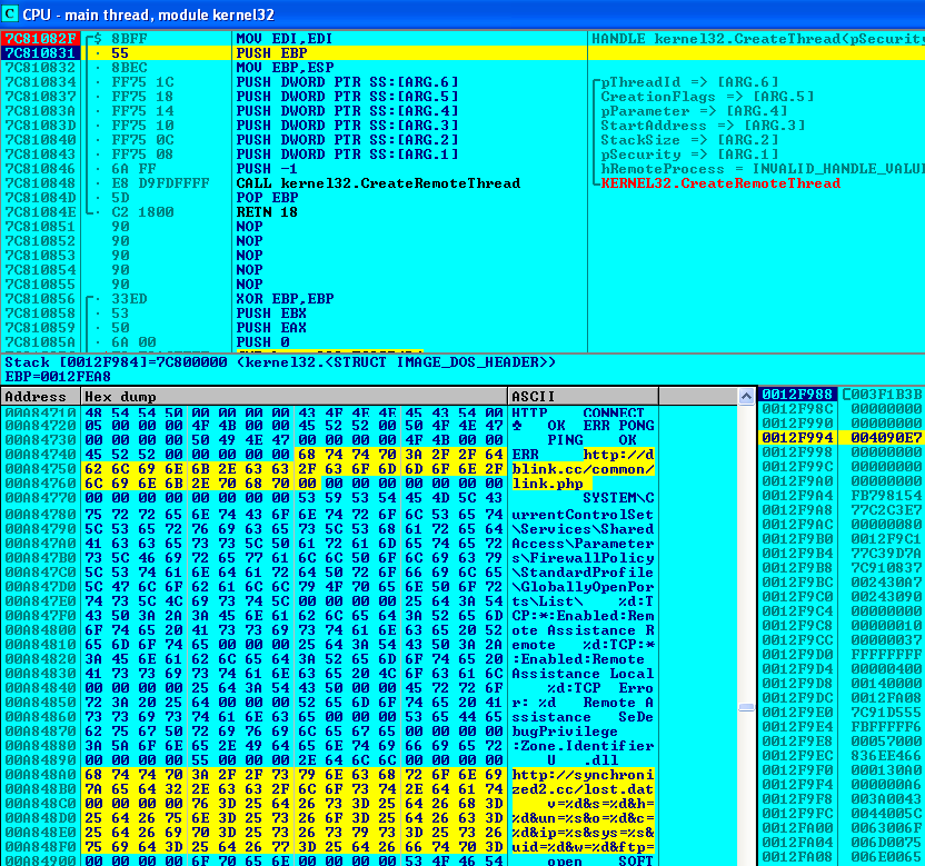 The injected code in the system explorer process is responsible for performing Command & Control (C&C) communication. It also opens up a port (TCP 36139) on the victim machine listening for incoming connections.
