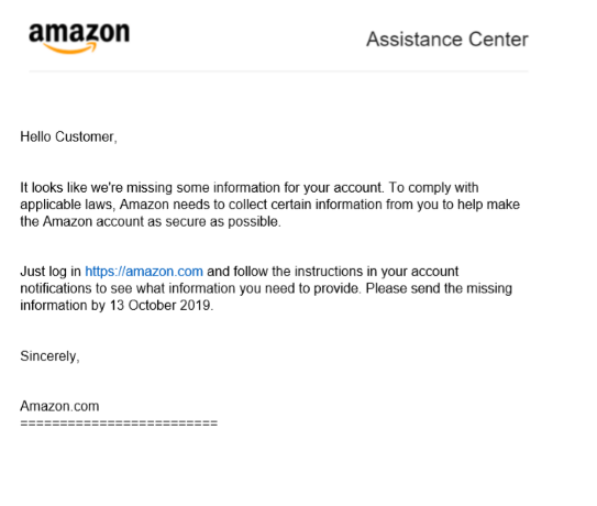 Figure 5: Letter impersonating Amazon in an attempt to capture user credentials