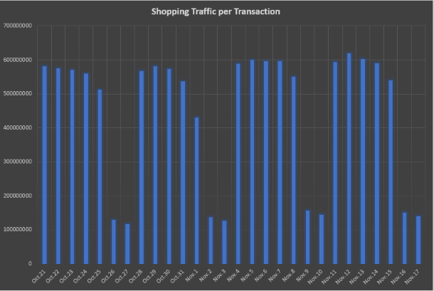 Figure 1: Shopping traffic on the Zscaler cloud between Oct. 21 and Nov. 17, 2019, averaging nearly 600 million transactions per weekday