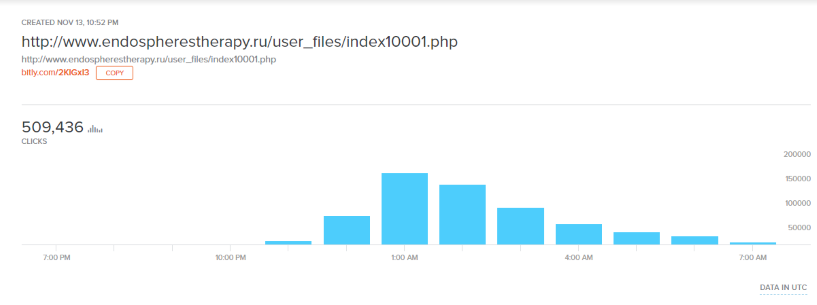 We also checked on the stats of the bit.ly link included in the original SMS message and observed that there were more than half a million clicks on this link in a 24-hour period, which shows the widespread reach of this scam.