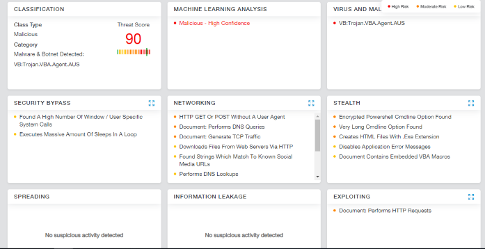 The PowerShell mentioned above will download and execute the Emotet trojan. Running this through a dynamic analysis will reveal a malicious attack.