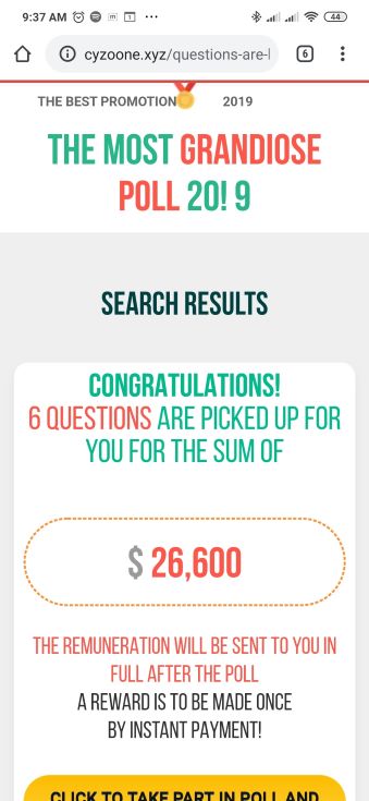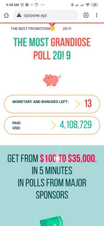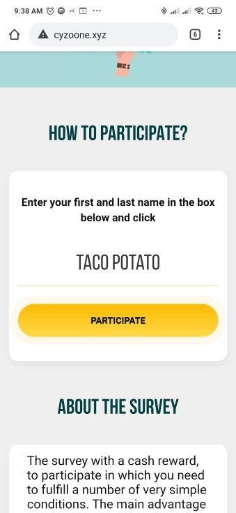 Once clicked, the user is redirected to cyzoone(.)xyz. This site poses as a poll site to lure victims into entering to win up to $35,000. To take part in the poll, victims have to register using their names.