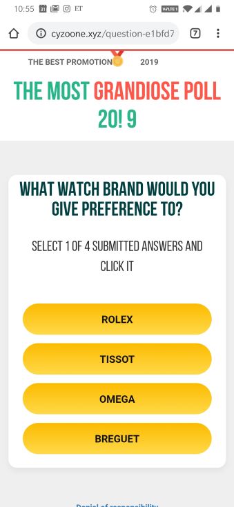 Upon clicking the PARTICIPATE button, the site begins asking poll questions. The questions we observed were about cars, perfumes, and watches, among other things, and can be observed in the following screenshots.