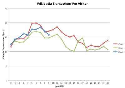 We can combine the two above graphs into a graph of transactions per unique visitor, and we see that this is much smaller today. This suggests that more people are flocking to Wikipedia today, but just to see the protest page and some details on SOPA. This behavior could be described as "online rubber necking".