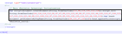 Here are some examples of very well hidden pieces of JavaScript that I've encountered. In the first example, the website is using vBulletin, an open-source forum application. All vBulletin pages contain inline JavaScript to call vBulletin_init(). The attacker inserted his JavaScript between the original JavaScript command, and the function call: