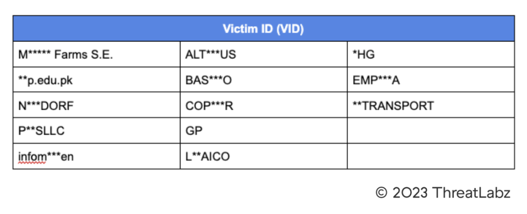 The victim ID (VID) values that ThreatLabz has observed in Trigona samples are shown in Table 2 (some of the values are obfuscated to protect the identity of the victim).