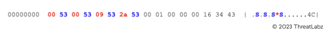Trigona is capable of encrypting files on local drives as well as network drives. For the former, the ransomware will enumerate all drive letters from A to Z. Before file encryption begins, Trigona pseudo randomly generates a single master 32-byte AES key that is used for encrypting all files. For each file, Trigona generates another 80 pseudo random byte block that consists of 32 bytes of padding, a 32-byte AES key and a 16-byte IV. This 80-byte block is then encrypted using a 4,112-bit RSA public key that is hardcoded in Trigona’s configuration. This randomly generated AES key and IV are used to encrypt another block of data using AES in CBC mode that contains the actual master AES key that is used for file encryption. The AES mode used for file encryption is Output feedback (OFB) in contrast to CBC mode (which is used to decrypt Trigona’s configuration information and the master AES key). After a file has been encrypted, Trigona appends a large footer to the end of the file that contains a variety of information including the file’s encrypted AES key parameters, a (per-file) pseudo random 16-byte IV, along with MD5 hash values of the AES key and the RSA public key that was used to encrypt the file. Trigona also adds random padding in the footer to avoid a fixed length. The footer starts with 8 bytes where each odd byte (red) when concatenated together forms the size of the footer and each even byte (blue) is the hex value 0x53 (or the letter ‘S’) as shown below: