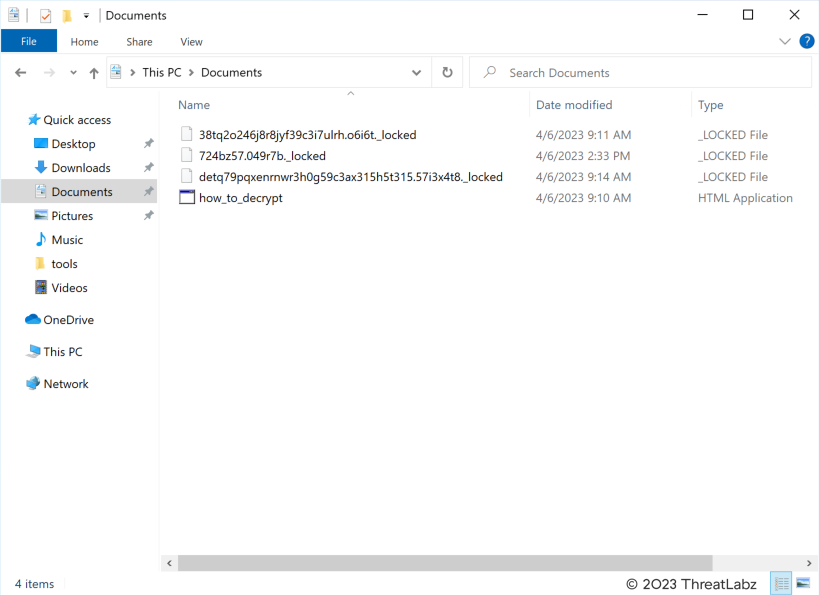 After a file is encrypted, the filename extension is replaced with _locked. In recent versions, Trigona will also replace the original filename with pseudo randomly generated characters with the format [a-z0-9]{1,50}.[a-z0-9]{1,10} and append the _locked extension. The original filename is encrypted using the same AES key and IV that is used to decrypt the file content in OFB mode and then appended to the file footer. Figure 2 shows an example directory after Trigona’s file encryption has completed.