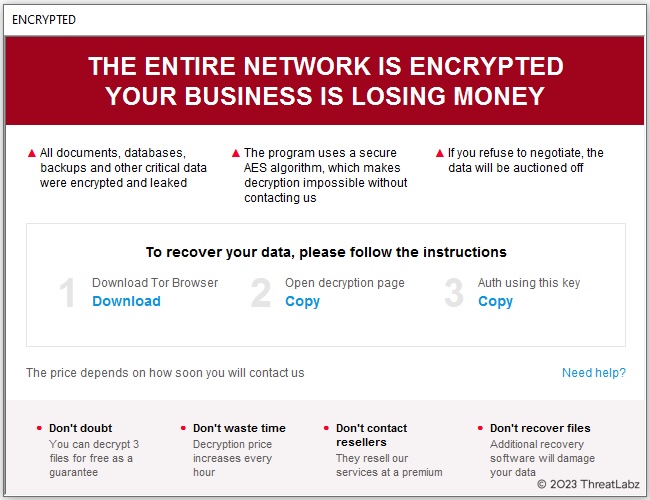 Trigona creates an HTML Application (HTA) file named how_to_decrypt.hta that contains the ransom note. Figure 3 shows an example of the Trigona ransom note when opened.