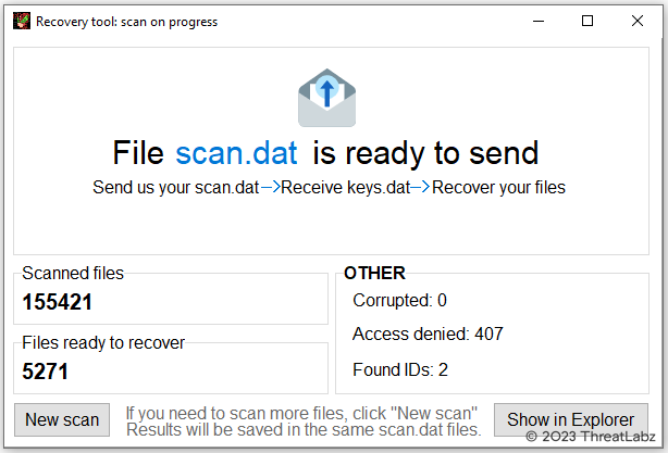 This keys.dat file requires a user to send the threat actor another file named scan.dat, which contains a set of one or more RSA encrypted AES keys. The victim can use the decryption tool to scan for encrypted files to generate the scan.dat file as shown in Figure 6.