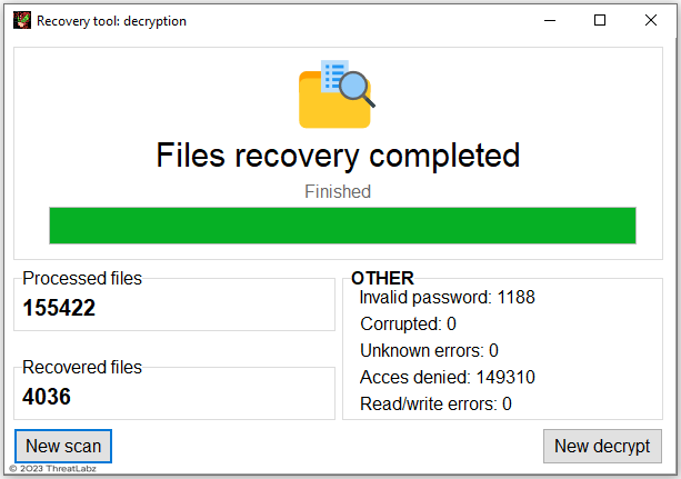 Figure 7. Trigona ransomware decryption tool after a scan has completed