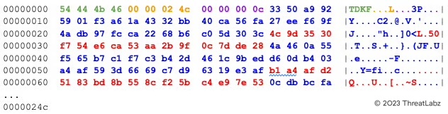 The keys.dat file header contains the magic bytes TDKF (green) followed by the subsequent keys.dat file size (orange), followed by the number of AES keys (purple), followed by one or more AES keys (blue) and the corresponding MD5 hash value (red) for each AES key as shown below.