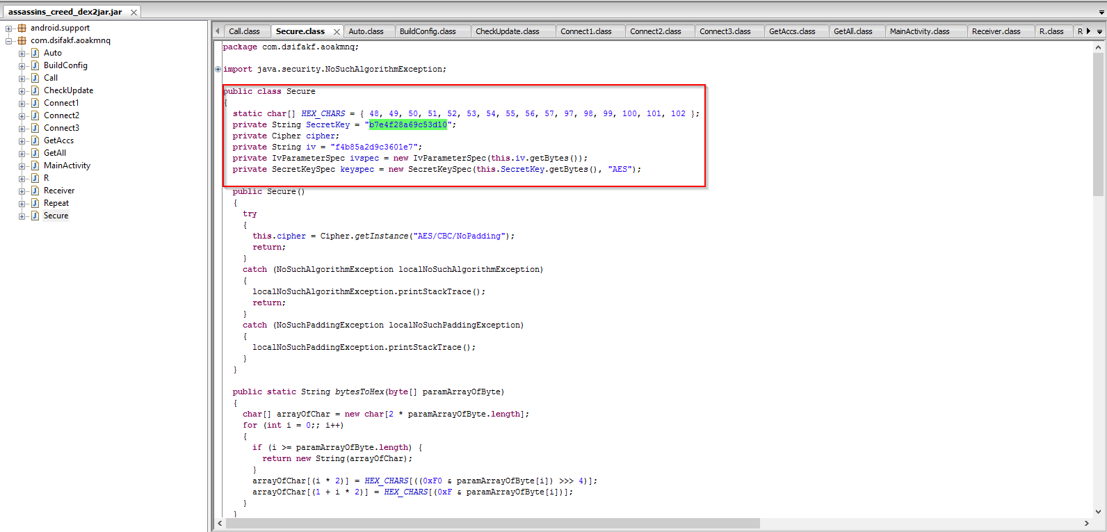 The screenshot below shows the AES crypto library configurations. All the sensitive harvested data and C2 communication is encrypted and decrypted using this configuration.